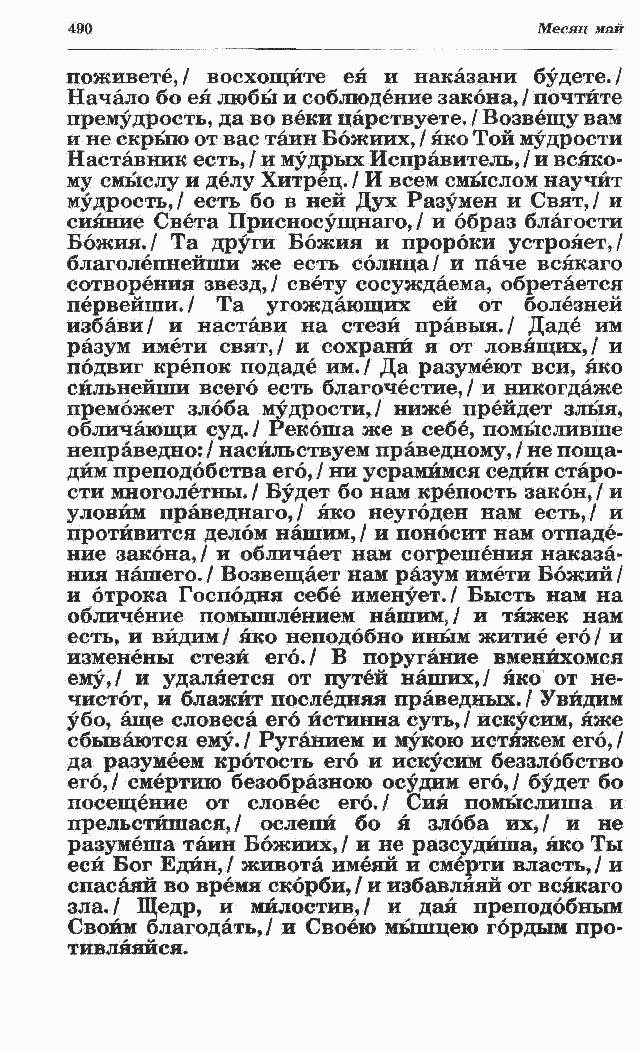 Начало бо ея любы и соблюдение закона, / почтите премудрость, да во веки царствуете. / Возвещу вам и не скрьпо от вас тайн Божиих, / яко Той мудрости Наставник есть, / и мудрых Исправитель, / и всяко- му смыслу и делу Хитрец. / И всем смыслом научит мудрость,/ есть бо в ней Дух Разумен и Свят,/ и сияние Света Присносущнаго, / и образ благости Божий. / Та друга Божия и пророки устрояет,/ благолепнейши же есть солнца/ и паче всякаго сотворения звезд,/ свету сосуждаема, обретается первейши./ Та угождающих ей от болезней избави/ и настави на стези правыя./ Даде им разум имети свят,/ и сохрани я от ловящих,/ и подвиг крепок подаде им./ Да разумеют вси, яко ейльнейпга всего есть благочестие,/ и никогдаже преможет злоба мудрости,/ ниже прейдет злыя, обличающи суд./ Рекоша же в себе, помысливше неправедно: / насйльствуем праведному, / не поща- дим преподобства его, / ни усрамимся седин старо- сти многолетны. / Будет бо нам крепость закон, / и уловим праведнаго,/ яко неугоден нам есть,/ и противится делом нашим, / и поносит нам отпаде- ние закона,/ и обличает нам согрешения наказа- ния нашего. / Возвещает нам разум имети Божий / и отрока Господня себе именует./ Бысть нам на обличение помышлением нашим,/ и тяжек нам есть, и видим/ яко неподобно иным житие его/ и изменены стези его./ В поругание вменйхомся ему, / и удаляется от путей наших, / яко от не- чистот, и блажит последняя праведных. / Увидим убо, аще словеса его истинна суть, / искусим, яже сбываются ему. / Руганием и мукою истяжем его, / да разумеем кротость его и искусим беззлобство его,/ смертию безобразною осудим его,/ будет бо посещение от словес его./ Сия помыслиша и прельстйшася,/ ослепи бо я злоба их,/ и не разумеша тайн Божиих, / и не разсудйша, яко Ты еси Бог Един, / живота имеяй и смерти власть, / и спасаяй во время скорби, / и избавляли от всякаго зла./ Щедр, и милостив,/ и дая преподобным Своим благодать,/ и Своею мышцею гордым про- тивляяйся. |