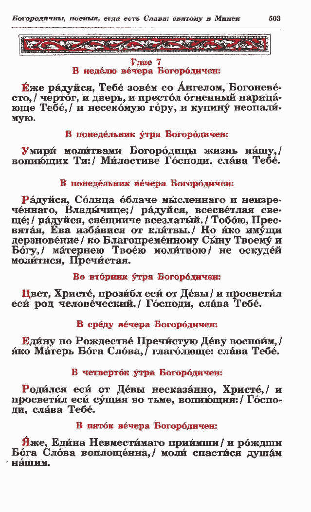 ченнаго, Владычице;/ радуйся, всесветлая све- ще; / радуйся, свещниче всезлатый. / Тобою, Прес- вятая, Ева избавися от клятвы./ Но яко имущи дерзновение / ко Благопременному Сыну Твоему и Богу,/ матернею Твоею молитвою/ не оскудей молйтися, Пречистая. Во вторник утра Богородичен: