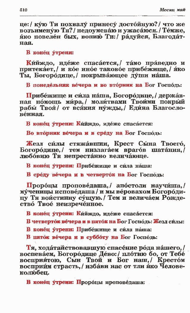 ная помощь мира,/ молитвами Твоими покрый рабы Твоя/ от всякия нужды,/ Едина Благосло- венная. В конец утрени: Кййждо, идеже спасается: