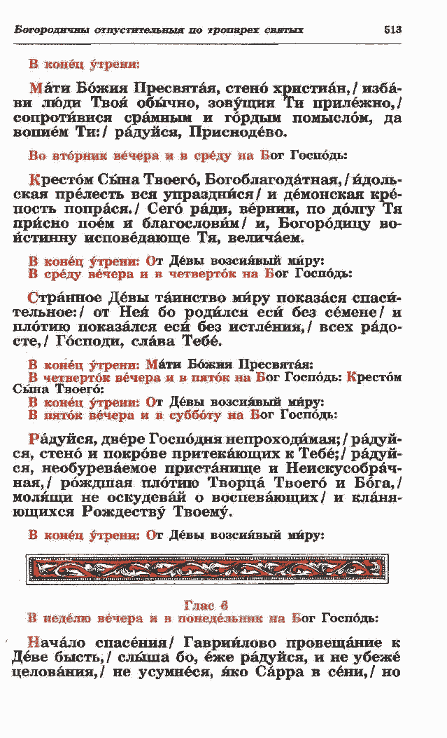 ся, стено и покрове притекающих к Тебе; / радуй- ся, необуреваемое пристанище и Неискусобрач- ная,/ рождшая плотию Творца Твоего и Бога,/ молящи не оскудевай о воспевающих/ и кланя- ющихся Рождеству Твоему. В конец утрени: От Девы возсиявый миру: