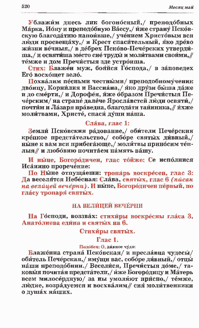 Земли Псковския радование,/ обители Печерския крепкое предстательство,/ соборе святых дивный,/ ныне к вам вси прибегающе,/ молитвы приносим теп- лый/ и любовию почитаем память вашу. И ныне, Богорбдичен, глас тбйже: Се исполнися