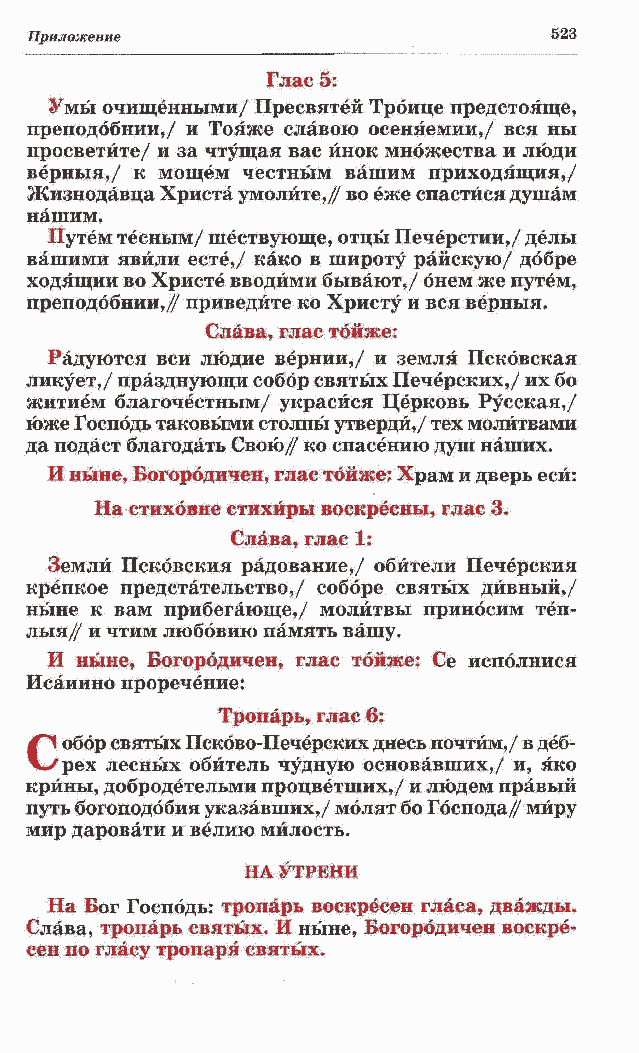 преподббнии,/ и Тояже славою осеняемии,/ вся ны просветите/ и за чтущая вас йнок множества и люди верныя,/ к мощем честным вашим приходящия,/ Жизнодавца Христа умолите,/ во еже спастйся душам нашим. Путем тесным/ шествующе, отцы Печерстии,/ делы