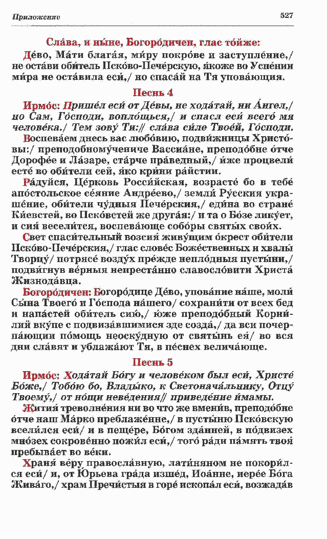 Пскбво-Печерския,/ глас словес Божественных и хвалы Творцу/ потрясе воздух прежде неплбдныя пустыни,/ подвигнув верныя непрестанно славослбвити Христа Жизнодавца. Богородичен: Богородице Дево, упование наше, моли