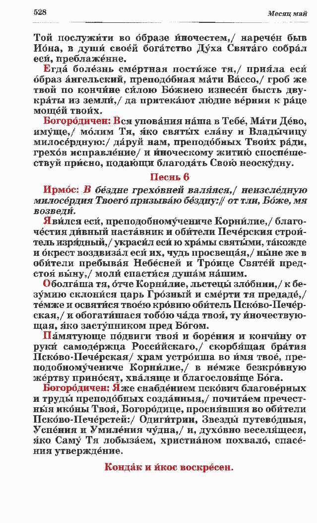 руки самодержца Россййскаго,/ скорбящая братия Псково-Печерская/ храм устроиша во имя твое, пре- подобномучениче Корнйлие,/ в немже безкрбвную жертву приносят, хваляще и благословяще Бога. Богородичен: Я же снабдением пскович благоверных