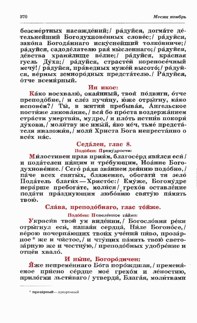 отрыгнул еси, напаяя сердца, Нйле Богоносе,/ верою почерпающих твоих учений пиво, прозар- ное * же и чистое, / и чтущих память твою свето- зарную же и честную, / преподобных удобрение и отцев хвало. И ныне, Богородичен: