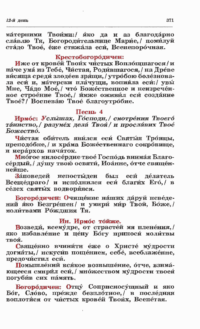 Иже от кровей Твоих чистых Воплощшагося / и паче ума из Тебе, Чистая, Родйвшагося, / на Древе вйсяща среди злодеев зрящи, / утробою болезнова- ла еси и, матерски плачущи, вопияла еси:/ увы Мне, Чадо Мое,/ что Божественное и неизречен- ное строение Твое,/ ймже оживил еси создание Твое?/ Воспеваю Твое благоутробие. Песнь 4