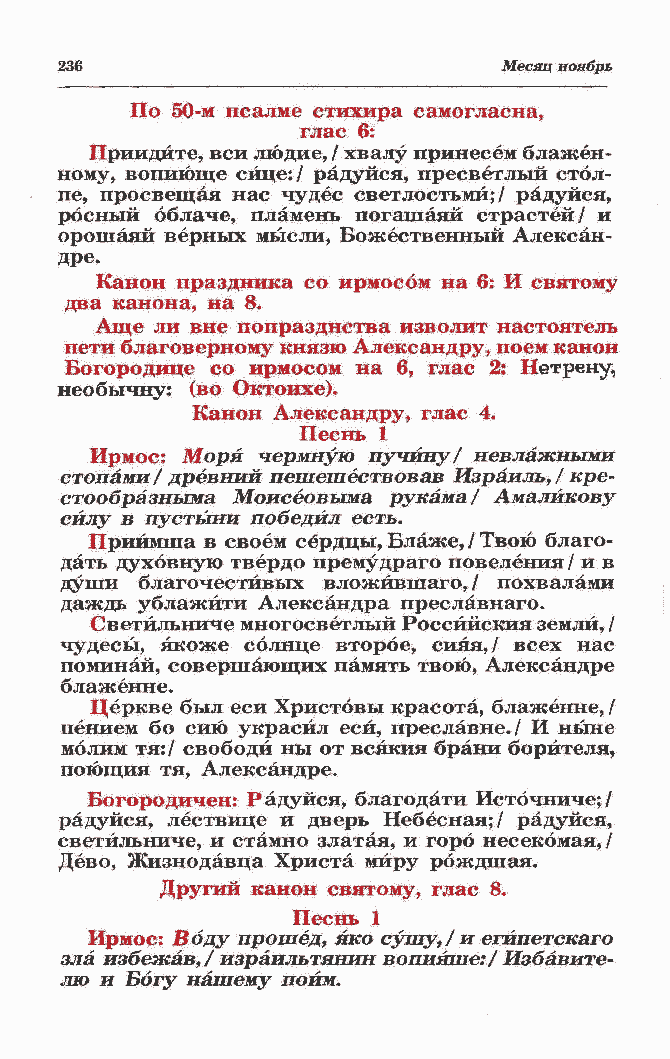 Приидйте, вси людие, / хвалу принесем блажен- ному, вопиюще сйце:/ радуйся, пресветлый стол- пе, просвещая нас чудес светлостьмй; / радуйся, росный бблаче, пламень погашаяй страстей/ и орошаяй верных мысли, Божественный Алексан- дре. Канон праздника со ирмосом на 6: И святому