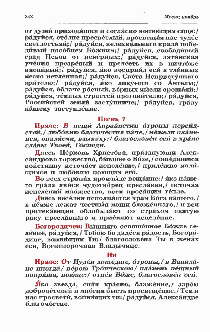 стей, / любовию благочестия паче, /нежели пламе- нем, опаляеми, взываху:/ благословен еси в храме славы Твоей, Господи. Днесь Церковь Христова, празднующи Алек-