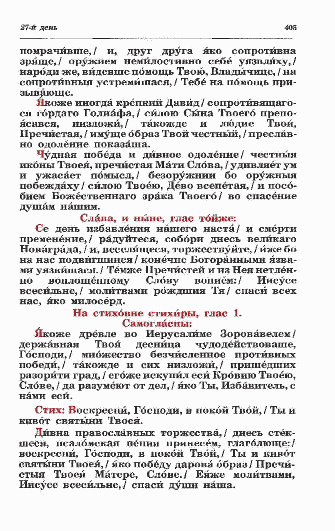 зряще, / оружием немйлостивно себе уязвляху, / народи же, вйдевше помощь Твою, Владычице, / на сопротйвныя устремйшася, / Тебе на помощь при- зывающе. Якоже иногда крепкий Давид/ сопротйвящаго-