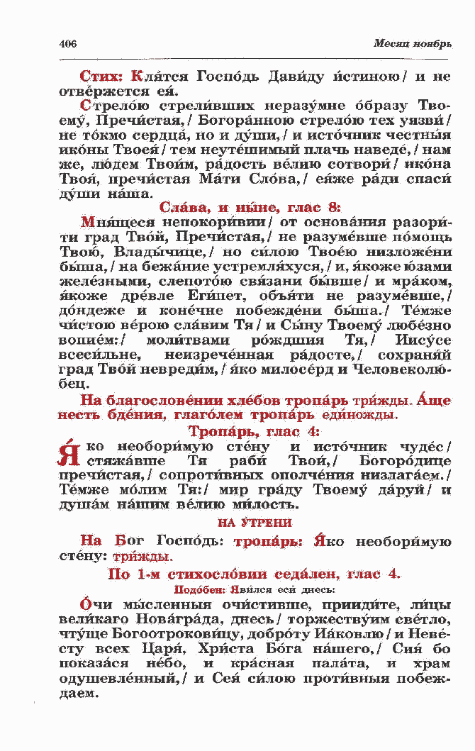 О» ко необоримую стену и источник чудес/ XI стяжавше Тя рабй Твой,/ Богородице пречистая,/ сопротйвных ополчения низлагаем./ Темже молим Тя:/ мир граду Твоему даруй/ и душам нашим велию милость. на Утрени