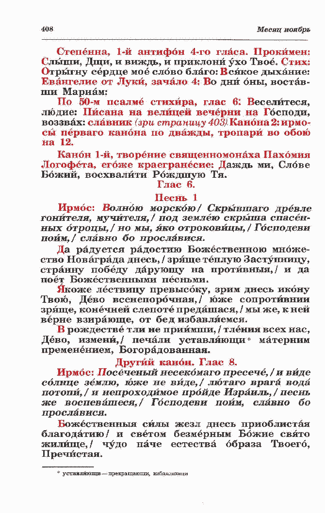 людие: Писана на велйцей вечерни на Господи, воззвах: славник (зри страницу 403).Канона 2: ирмо- сы перваго канона по дважды, тропари во обою на 12. Канон 1-й, творение священномонаха Пахомия