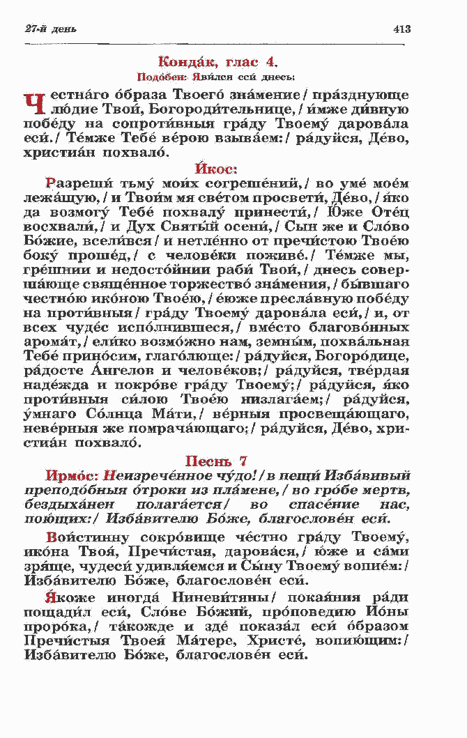 Разреши тьму моих согрешений,/ во уме моем лежащую, / и Твоим мя светом просвети, Дево, / яко да возмогу Тебе похвалу принести,/ Юже Отец восхвали, / и Дух Святый осени, / Сын же и Слово Ббжие, вселйвся/ и нетленно от пречистою Твоею боку прошед,/ с человеки поживе./ Темже мы, грешнии и недостбйнии рабй Твой, / днесь совер- шающе священное торжество знамения, / бывшаго честною иконою Твоею, / еюже преславную победу на протйвныя / граду Твоему даровала еси, / и, от всех чудес исполнившеся, / вместо благовонных аромат, / елйко возможно нам, земным, похвальная Тебе приносим, глаголюще: / радуйся, Богородице, радосте Ангелов и человеков;/ радуйся, твердая надежда и покрове граду Твоему;/ радуйся, яко протйвныя силою Твоею низлагаем;/ радуйся, умнаго Солнца Мати, / верныя просвещающаго, неверныя же помрачающаго; / радуйся, Дево, хри- стиан похвалб. Песнь 7