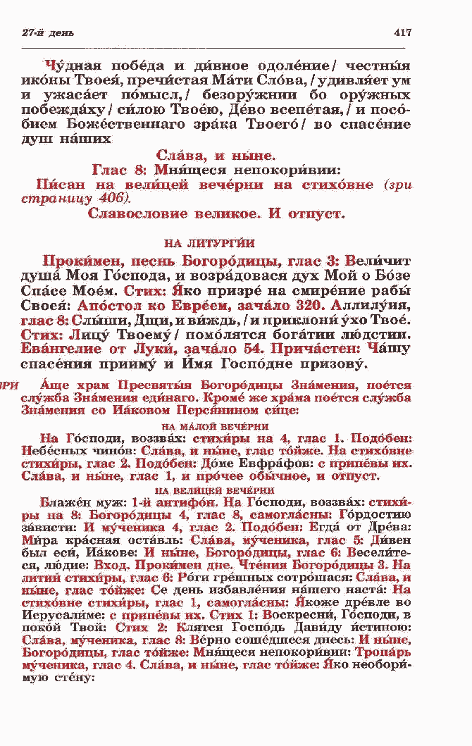 ры на 8: Богородицы 4, глас 8, самогласны: Гордостию зависти: И мученика 4, глас 2. Подобен: Егда от Древа: Мира красная оставль: Слава, мученика, глас 5: Дивен был еси, Иакове: И ныне, Богородицы, глас 6: Веселйте- ся, людие: Вход. Прокимен дне. Чтения Богородицы 3. На литий стихиры, глас 6: Рбги грешных сотрбшася: Слава, и ныне, глас тойже: Се день избавления нашего наста: На стиховне стихиры, глас 1, самогласны: Якоже древле во Иерусалиме: с припевы их. Стих 1: Воскресни, Господи, в покой Твой: Стих 2: Клятся Господь Давиду истиною: Слава, мученика, глас 8: Верно сошедшеся днесь: И ныне, Богородицы, глас тойже: Мнящеся непокорйвии: Тропарь мученика, глас 4. Слава, и ныне, глас тойже: Яко необори- мую стену: |