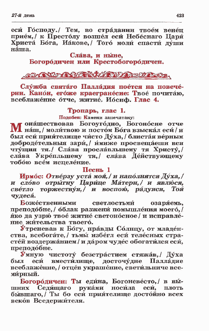 был еси вместилище, досточудне Палладие всеблаженне, / отцев украшение, светйльниче все- мирный. Богородичен: Ты едина, Богоневесто, / в вы-