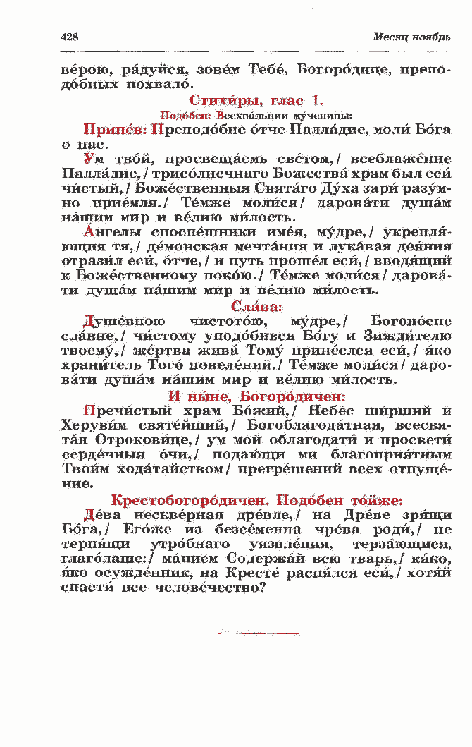 Пречистый храм Божий, / Небес шйрший и Херувим святейший,/ Богоблагодатная, веесвя- тая Отроковице,/ ум мой облагодатй и просвети сердечныя очи,/ подающи ми благоприятным Твоим ходатайством/ прегрешений всех отпуще- ние. Крестобогородичен. Подобен тойже: