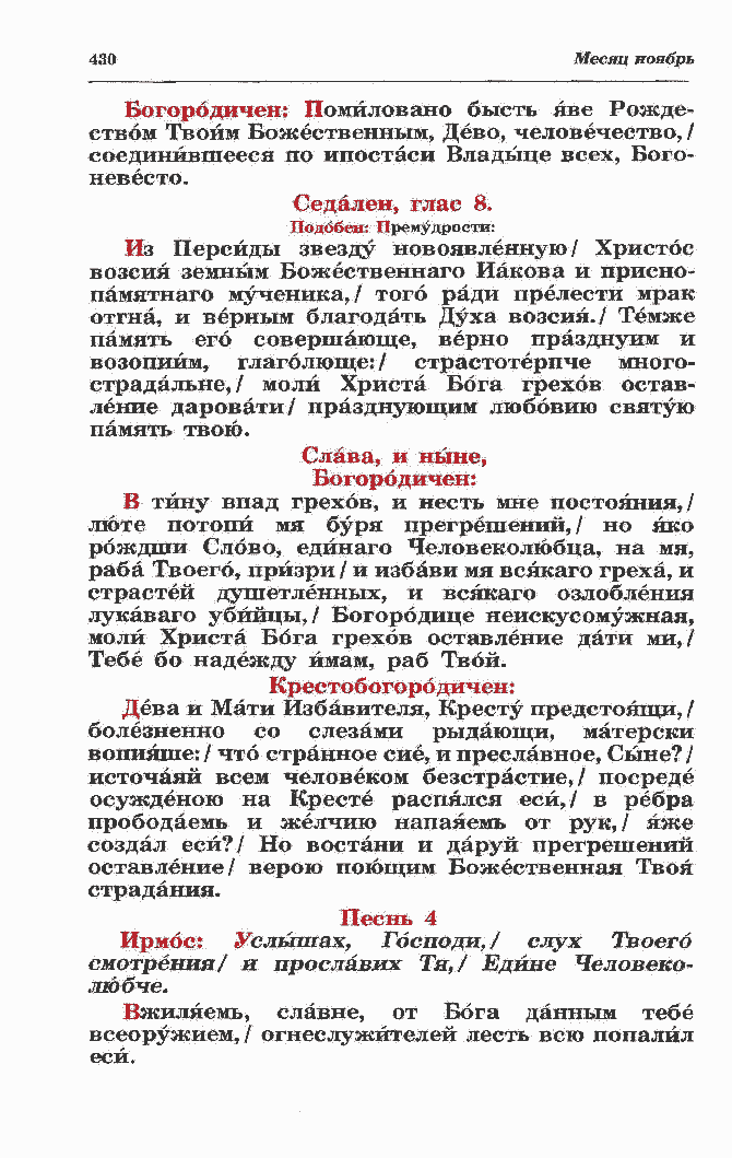 возсия земным Божественнаго Иакова и присно- памятнаго мученика,/ того ради прелести мрак отгна, и верным благодать Духа возсия./ Темже память его совершающе, верно празднуим и возопийм, глаголюще:/ страстотерпче много- страдальнее моли Христа Бога грехов остав- ление даровати/ празднующим любовию святую память твою. Слава, и ныне,