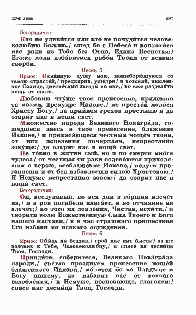 народи,/ светло празднуем пренесение мощей блаженнаго Иакова,/ молится бо ко Владыце и Богу нашему, да избавит нас от всякаго озлобления,/ к Немуже, воспевающе, глаголем:/ спасе нас десница Твоя, Господи. |