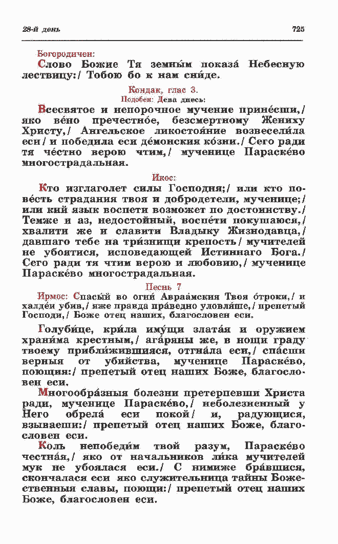 ради, мученице Параскево,/ неболезненный у Него обрела еси покой/ и, радующися, взывавши:/ препетый отец наших Боже, благо- словен еси. Коль непобедим твой разум, Параскево