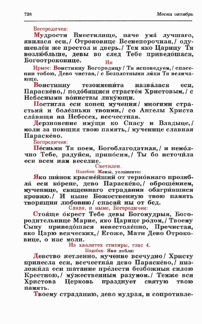 ла еси корене, дево Параскево,/ оброшением, мученице, священнаго страдания обагрйвшися кровию./ И ныне Божественную твою память творящия любовию/ спасай ны от бед.