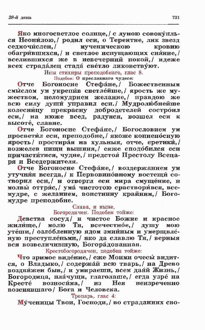 вселившихся же в невечерний покой,/ идеже всех страдалец стада светло ликовствуют. Ины стихиры преподобнаго, глас 8. Подобен: О преславнаго чудесе: Отче Богоносне Стефане,/ Божественным