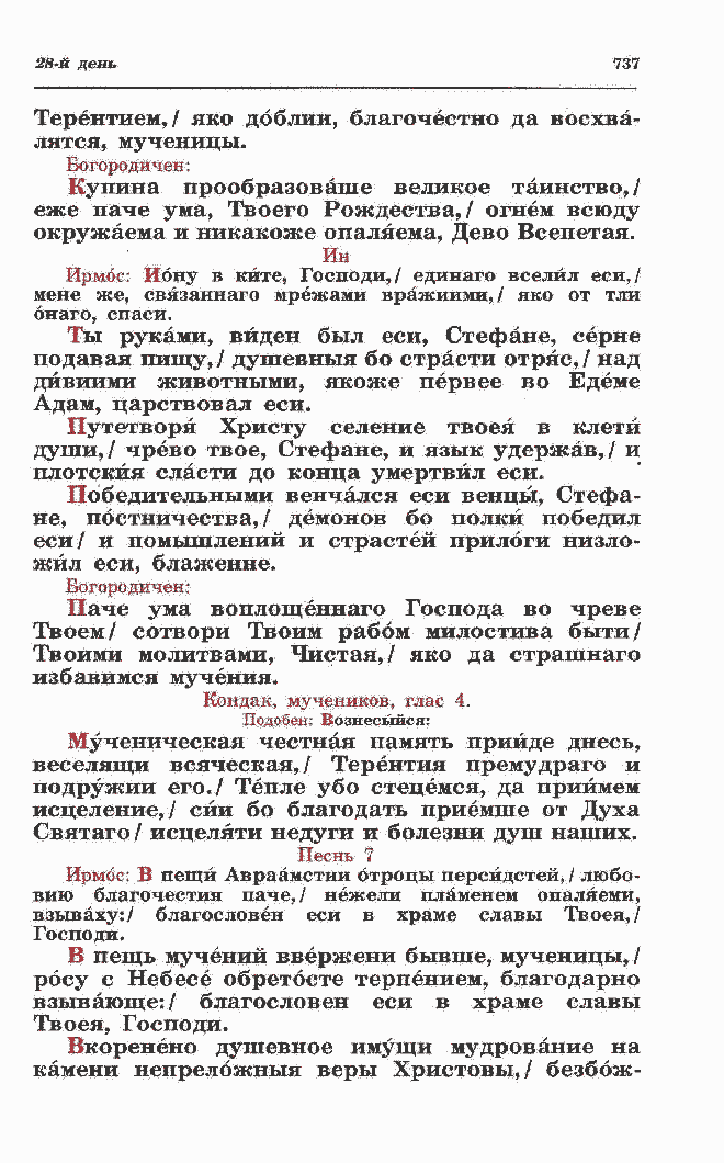 вию благочестия паче,/ нежели пламенем опаляеми, взываху:/ благословен еси в храме славы Твоея,/ Господи. В пещь мучений ввержени бывше, мученицы,/