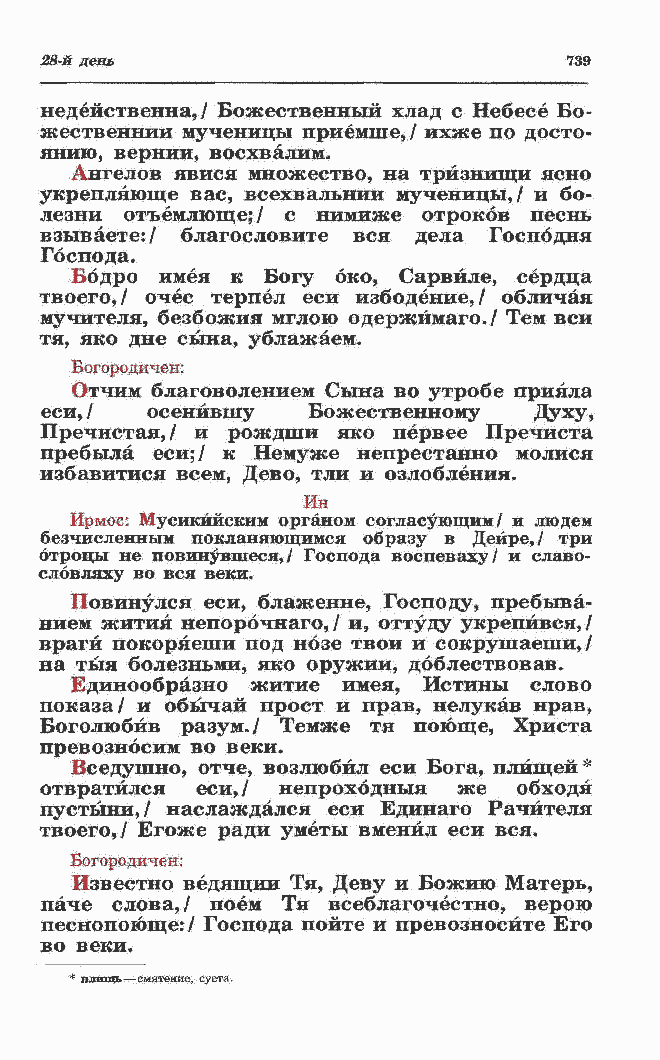 Ирмос: Мусикййским органом согласующим/ и людем безчисленным покланяющимся образу в Дейре, / три отроцы не повинувшеся, / Господа воспеваху/ и славо- с лов ляху во вся веки. Повинулся еси, блаженне, Господу, пребыва-