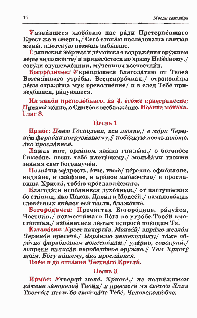 Чермнбе пресече,/ Израилю пешеходящу;/ тоже об- ратно фараоновым колесницам,/ ударив, совокупи,/ вопреки написав непобедимое оружие.// Тем Христу пойм, Богу нашему, яко прославися. Поем и до отдания Честнаго Креста.