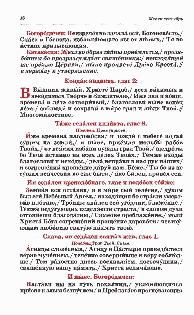 бением бо предразсуждает священника;/ неплодящей же прежде Церкви,/ ныне процвете Древо Крести,// в державу и утверждение» Кондак индикта, глас 2:
