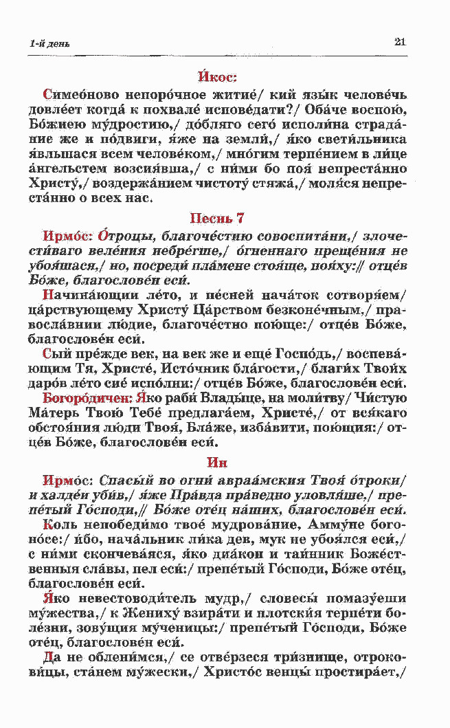 стйваго веления небрегше,/ бгненнаго прещения не убояшася,/ но, посреди пламене стояще, пояху:// отцев Боже, благословен еси. Начинающий лето, и песней начаток сотворяем/
