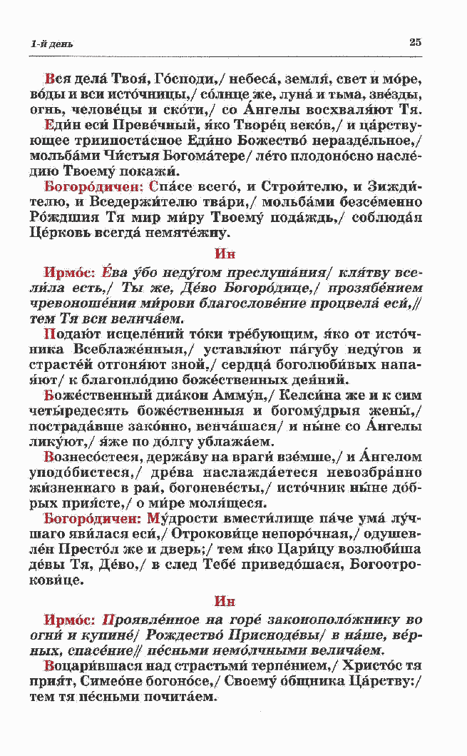 телю, и Вседержителю твари,/ мольбами безсеменно Рбждшия Тя мир миру Твоему подаждь,/ соблюдая Церковь всегда немятежну. Ин