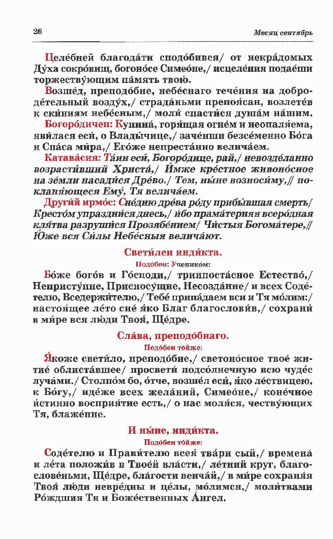 тие облиставшее/ просвети подсолнечную всю чудес лучами./ Столпом бо, отче, возшел еси, яко лествицею, к Богу,/ идеже всех желаний, Симеоне,/ конечное истинно восприятие есть,/ о нас моляся, чествующих Тя, блаженне. И ныне, индикта.