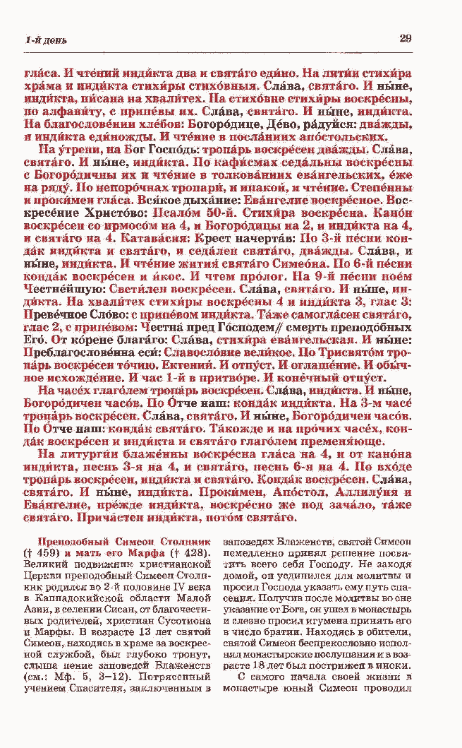 святаго. И ныне, индикта. По кафйсмах седальны воскресны с Богорбдичны их и чтение в толкованиях евангельских, еже на ряду. По непорбчнах тропари, и инакой, и чтение. Степенны и прокимен гласа. Всякое дыхание: Евангелие воскресное. Вос- кресение Христово: Псалом 50-й. Стихира воскресна. Канон воскресен со ирмосом на 4, и Богородицы на 2, и индикта на 4, и святаго на 4. Катавасия: Крест начертав: По 3-й песни кон- дак индикта и святаго, и седален святаго, дважды. Слава, и ныне, индикта. И чтение жития святаго Симеона. По 6-й песни кондак воскресен и йкос. И чтем пролог. На 9-й песни поем Честнейшую: Светилен воскресен. Слава, святаго. И ныне, ин- дикта. На хвалйтех стихиры воскресны 4 и индикта 3, глас 3: Превечное Слово: с припевом индикта. Таже самогласен святаго, глас 2, с припевом: Честна пред Гбсподем/ смерть преподобных Его. От корене благаго: Слава, стихира евангельская. И ныне: Преблагословенна еси: Славословие великое. По Трисвятбм тро- парь воскресен точию. Ектений. И отпуст. И оглашение. И обыч- ное исхождение. И час 1-й в притворе. И конечный отпуст. На часех глаголем тропарь воскресен. Слава, индикта. И ныне,