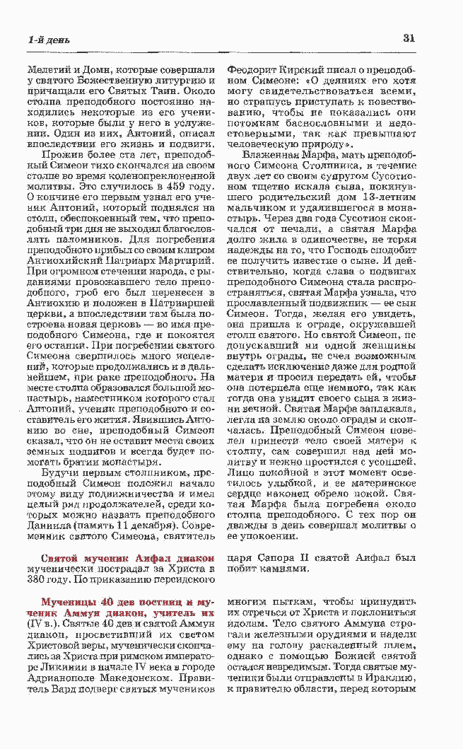 ного Симеона Столпника, в течение двух лет со своим супругом Сусотио- ном тщетно искала сына, покинув- шего родительский дом 13-летним мальчиком и удалившегося в мона- стырь. Через два года Сусотион скон- чался от печали, а святая Марфа долго жила в одиночестве, не теряя надежды на то, что Господь сподобит ее получить известие о сыне. Й дей- ствительно, когда слава о подвигах преподобного Симеона стала распро- страняться, святая Марфа узнала, что прославленный подвижник ? ее сын Симеон. Тогда, желая его увидеть, она пришла к ограде, окружавшей столп святого. Но святой Симеон, не допускавший ни одной женщины внутрь ограды, не счел возможным сделать исключение даже для родной матери и просил передать ей, чтобы она потерпела еще немного, так как тогда она увидит своего сына в жиз- ни вечной. Святая Марфа заплакала, легла на землю около ограды и скон- чалась. Преподобный Симеон пове- лел принести тело своей матери к столпу, сам совершил над ней мо- литву и нежно простился с усопшей. Лицо покойной в этот момент осве- тилось улыбкой, и ее материнское сердце наконец обрело покой. Свя- тая Марфа была погребена около столпа преподобного. С тех пор он дважды в день совершал молитвы о ее упокоении. царя Сапора II святой Аифал был