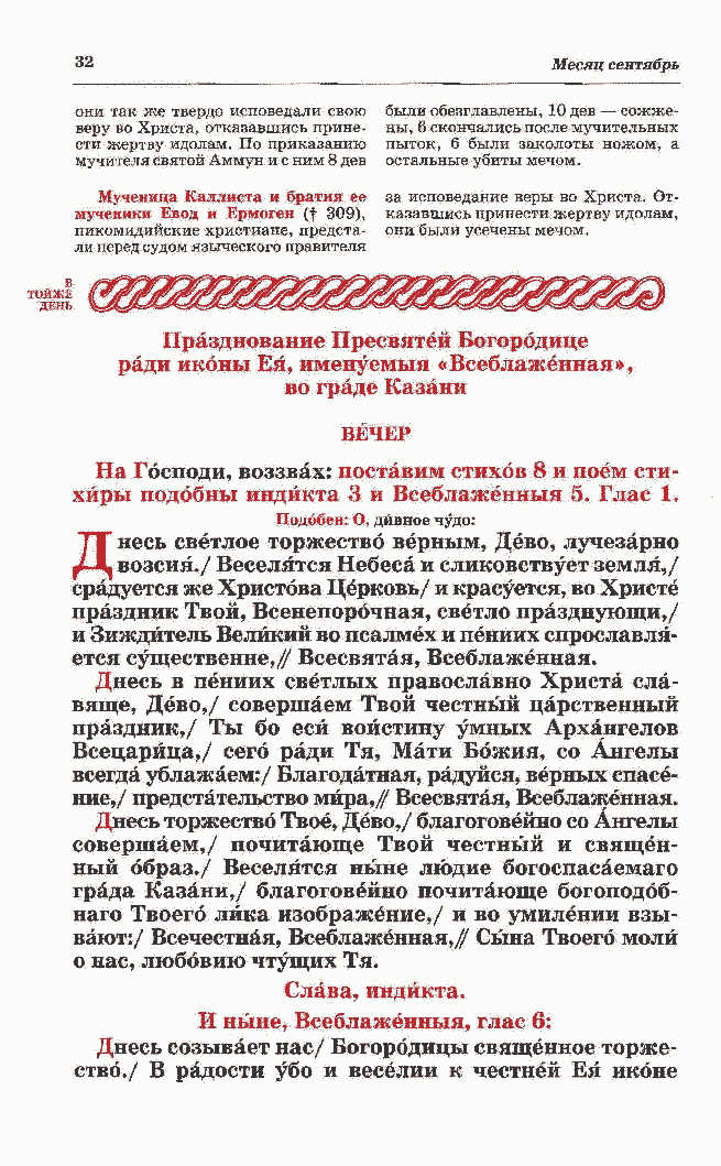 совершаем,/ почитающе Твой честный и священ- ный образ./ Веселятся ныне людие богоспасаемаго града Казани,/ благоговейно почитающе богоподоб- наго Твоего лика изображение,/ и во умилении взы- вают:/ Всечестная, Всеблаженная,/ Сына Твоего моли о нас, любовию чтущих Тя. Слава, индикта.