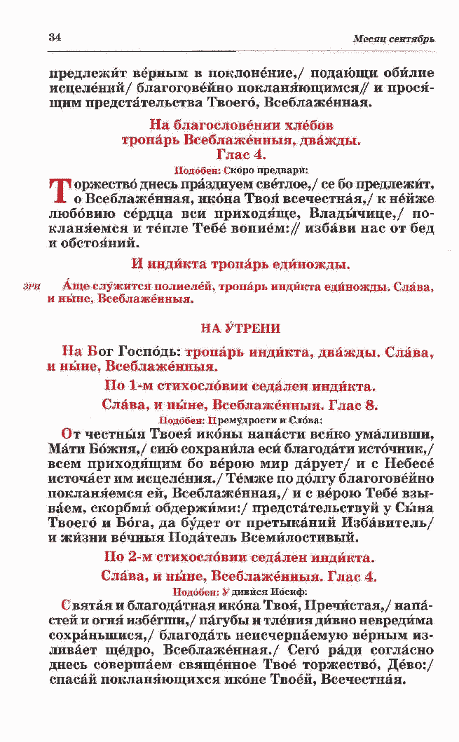 Мати Божия,/ сию сохранила еси благодати источник,/ всем приходящим бо верою мир дарует/ и с Небесе источает им исцеления./ Темже по долгу благоговейно покланяемся ей, Всеблаженная,/ и с верою Тебе взы- ваем, скорбмй обдержйми:/ предстательствуй у Сына Твоего и Бога, да будет от претыканий Избавитель/ и жизни вечныя Податель Всемилостивый. По 2-м стихословии седален индикта.