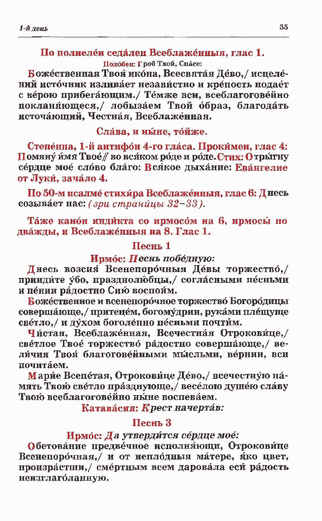 светлое Твое торжество радостно совершающе,/ ве- личия Твоя благоговейными мысльми, вернии, вси почитаем. Марйе Всепетая, Отроковице Дево,/ веечестную па-
