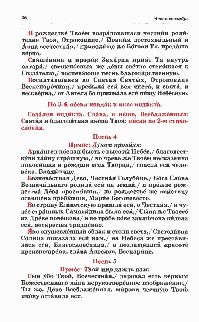 Всенепорочная,/ пребыла еси вся чиста, и свята, и нескверна,/ от Ангела бо приимала еси пищу Небесную. По 3-й песни кондак и икос индикта.