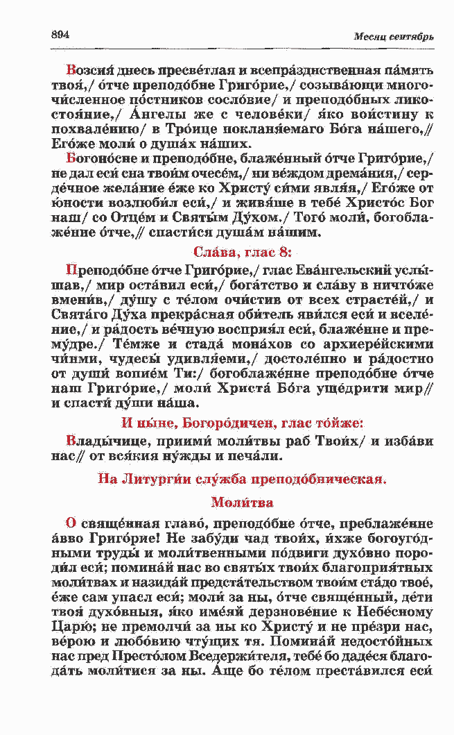 шав,/ мир оставил еси,/ богатство и славу в ничтбже вменив,/ душу с телом очистив от всех страстей,/ и Святаго Духа прекрасная обитель явился еси и вселе- ние,/ и радость вечную восприял еси, блаженне и пре- мудре./ Темже и стада монахов со архиерейскими чйнми, чудесы удивляеми,/ достолепно и радостно от души вопием Ти:/ богоблаженне преподобие отче наш Григбрие,/ моли Христа Бога ущедрити мир// и спасти души наша. И ныне, Богорбдичен, глас тбйже: