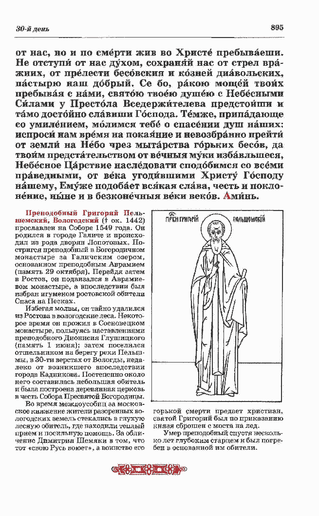 из Ростова в вологодские леса. Некото- рое время он прожил в Сосновецком монастыре, пользуясь наставлениями преподобного Дионисия Глушицкого (память 1 июня); затем поселился отшельником на берегу реки Пелып- мы, в 30-ти верстах от Вологды, неда- леко от возникшего впоследствии города Кадникова. Постепенно около него составилась небольшая обитель и была построена деревянная церковь в честь Собора Пресвятой Богородицы. Во время междоусобиц за москов-