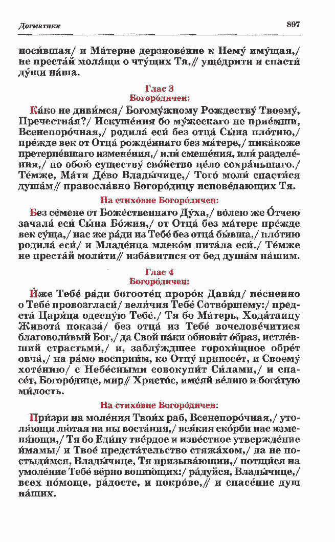 Пречестная?/ Искушения бо мужескаго не приемши, Всенепорбчная,/ родила еси без отца Сына плбтию,/ прежде век от Отца рожденнаго без матере,/ никакоже претерпевшаго изменения,/ или смешения, или разделе- ния,/ но обою существу свойство цело сохранынаго./ Темже, Мати Дево Владычице,/ Того моли спастйся душами православно Богородицу исповедающих Тя. На стиховне Богородичен:
