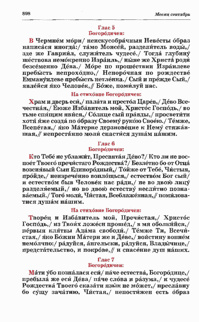 поет Твоего пречйстаго Рождества?/ Безлетно бо от Отца возсиявый Сын Единородный,/ Тбйже от Тебе, Чйстыя, пройде,/ неизреченно воплбщься,/ естеством Бог сый/ и естеством быв Человек нас ради,/ не во двою лицу разделяемый,/ но во двою естеству неслйтно позна- ваемый./ Того моли, Чистая, Всеблаженная,/ помйлова- тися душам нашим. На стиховне Богорбдичен:
