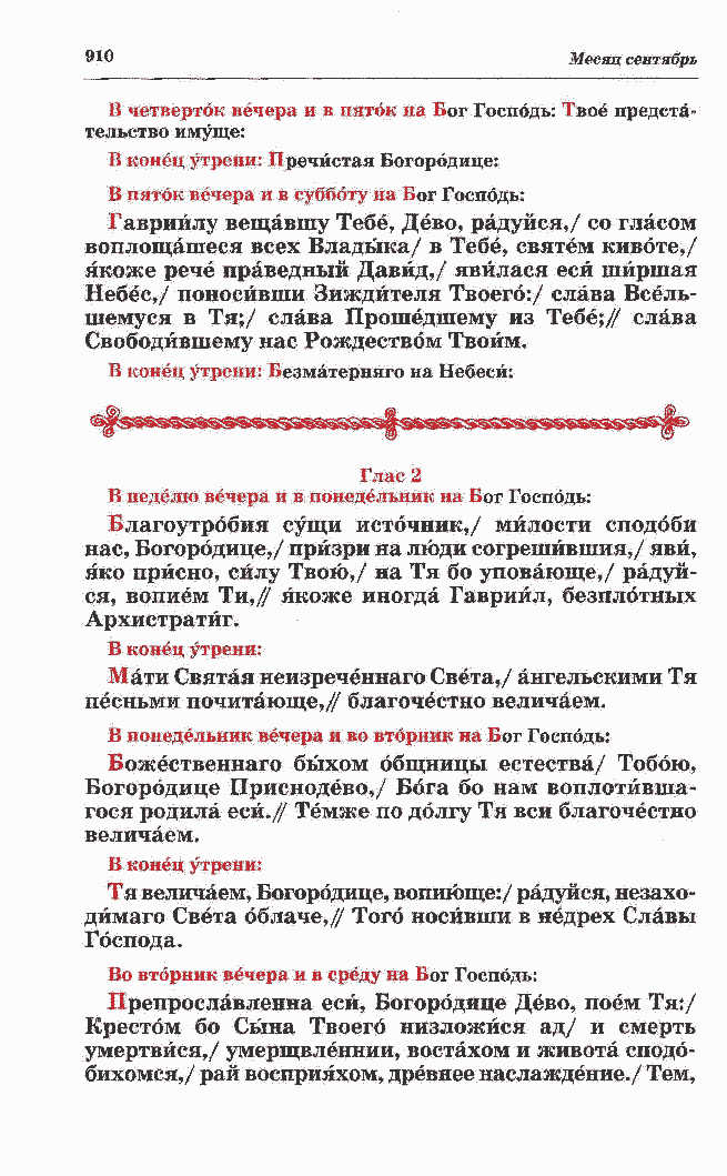 воплощашеся всех Владыка/ в Тебе, святем кивоте,/ якоже рече праведный Давид,/ явйлася еси шйршая Небес,/ поносивши Зиждителя Твоего:/ слава Всель- шемуся в Тя;/ слава Прошедшему из Тебе;// слава Свободйвшему нас Рождеством Твоим. В конец утрени: Безматерняго на Небесй: