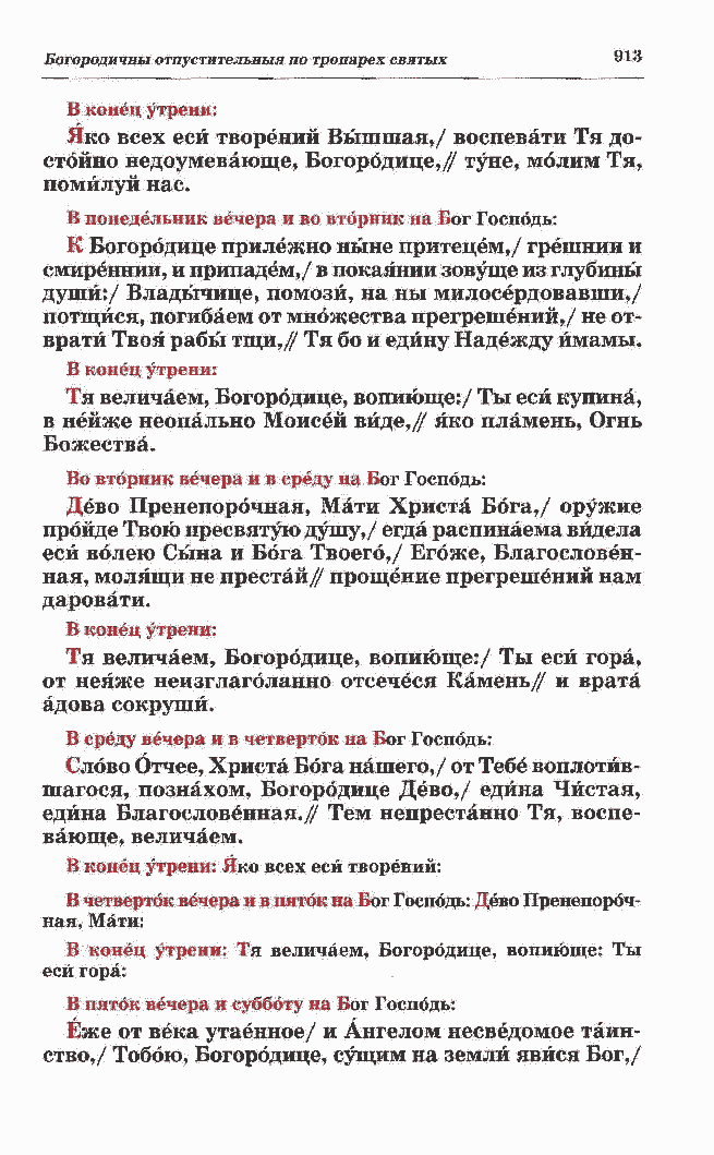 смиреннии, и припадем,/ в покаянии зовуще из глубины души:/ Владычице, помозй, на ны милосердовавши,/ потщйся, погибаем от множества прегрешений,/ не от- врати Твоя рабы тщи,// Тя бо и едйну Надежду имамы. В конец утрени:
