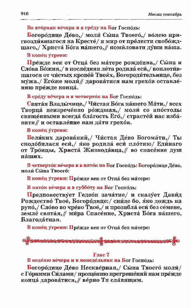 сподббилася еси,/ яко родила еси плбтию/ Едйнаго от Троицы, Христа Жизнодавца,// во спасение душ наших. В четверток вечера и в пяток на Бог Господь: Богородице Дево,